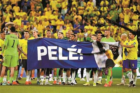 ■当地时间12月5日,卡塔尔世界杯,球员们在比赛结束后举着横幅,为身患重病的贝利祈福。 VCG/图