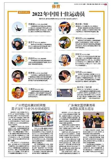 据新华社电 新华社体育部昨天评出2022年中国十佳运动员,名单如下: