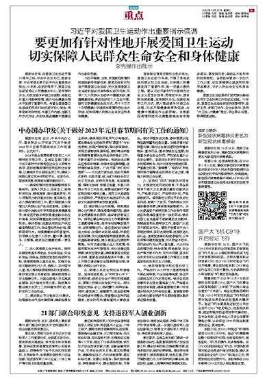 国务院总理李克强作出批示指出,爱国卫生运动70年来,开展了卓有成效的群众性卫生活动,为保障人民健康发挥了重要作用,是一项重大惠民工程。要以习近平新时代中国特色社会主义思想为指导,贯彻党中央、国务院决策部署,坚持预防为主,创新机制和工作方式,深入推进城乡环境卫生治理,扎实开展健康教育和促进,为健康中国建设作出新贡献。当前新冠疫情防控优化调整措施在有序推进落实,要发挥优势,调动各方面科学防控积极性。各级政府要进一步加大工作力度,切实保障群众就医和防疫用品需求,守护人民生命安全和身体健康。