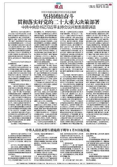 会议强调,今年是党和国家历史上极为重要的一年。我们胜利召开党的二十大,描绘了全面建设社会主义现代化国家的宏伟蓝图。面对风高浪急的国际环境和艰巨繁重的国内改革发展稳定任务,以习近平同志为核心的党中央团结带领全党全国各族人民迎难而上,全面落实疫情要防住、经济要稳住、发展要安全的要求,统筹国内国际两个大局,统筹疫情防控和经济社会发展,统筹发展和安全,加大宏观调控力度,应对超预期因素冲击,保持了经济社会大局稳定。全年经济保持增长,就业总体稳定,物价平稳,国际收支状况较好。粮食产量连续八年保持在1.3万亿斤以上,粮食安全、能源安全和人民生活得到有效保障。成功举办北京冬奥会、冬残奥会。这些成绩殊为不易,值得倍加珍惜。