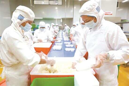 凌晨三时,万籁俱静,广州南沙区骏马大道的多满分食品集团(下简称多满分),此时已灯火通明。“咔咔!”“嚓嚓!”……数百名被工作服、帽子、口罩、手套和筒靴包裹着的工作人员分布在万余平方米的中央厨房里,娴熟地操控着大大小小的按钮、开关,长长的流水线上,洁白的餐盒像一个个跳动的音符,与灵动的双手合奏着色、香、味交融的美妙晨曲。