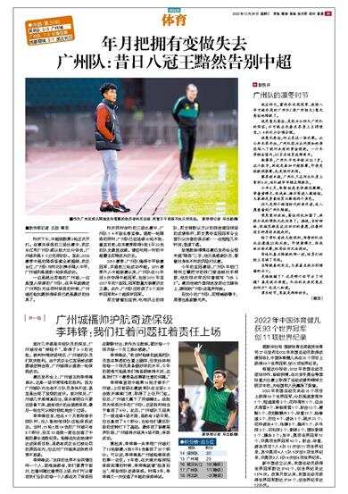 昨天同时举行的三场比赛中,广州队1∶4不敌长春亚泰。提前一轮降级的同时,广州队已经连续20轮不胜,截至目前,在本赛季取得3胜8平22负的队史最差战绩。曾经叱咤一时的中超霸主即将成为历史。
