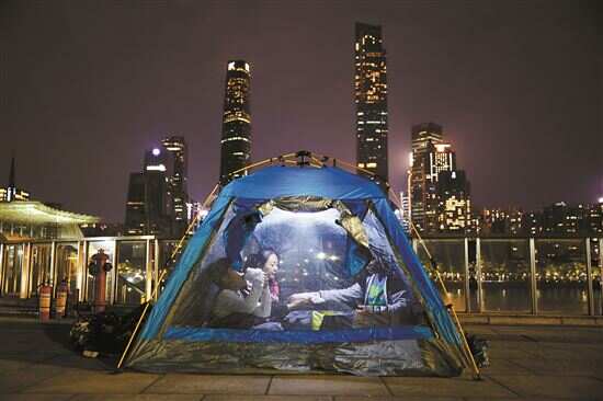 2022.12.10 市民游客可到广州塔二楼珠江摄影观景平台露营,限额400名,可通过广州塔小程序免费预约。不少市民朋友在地标之下与亲朋好友围炉夜话、烹酒煮茶,共享珠江美景!新快报记者 邓迪/摄