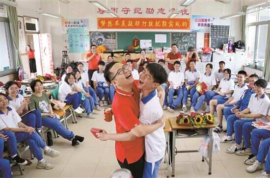 2022.06.06 高考前一天,广州大学附属中学的高三学生与老师在最后一堂课上相互拥抱,为明天进行的考试加油鼓劲。新快报记者 夏世焱/摄