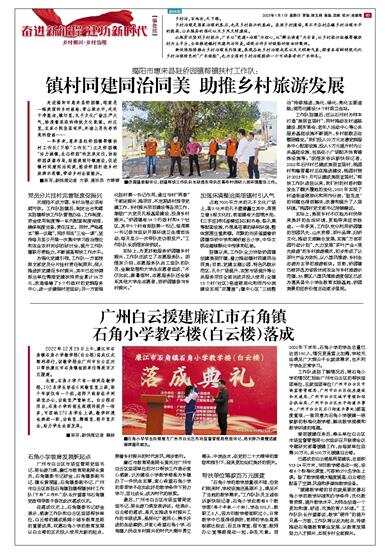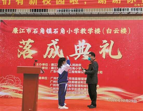2022年12月29日上午,廉江市石角镇石角小学教学楼(白云楼)落成仪式顺利举行,该教学楼由广州市白云区对口帮扶廉江市石角镇组团单位筹款百万元援建。
