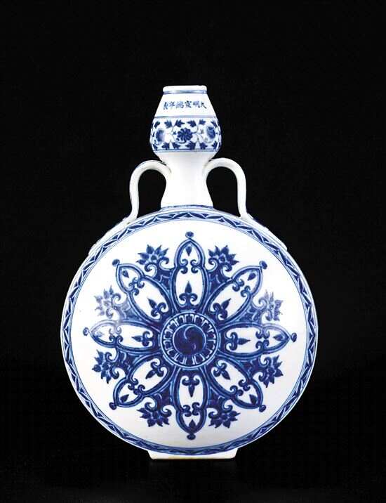 ■明宣德《青花宝相花纹抱月瓶》,此器附带夏君定古陶瓷热释光年代检测报告