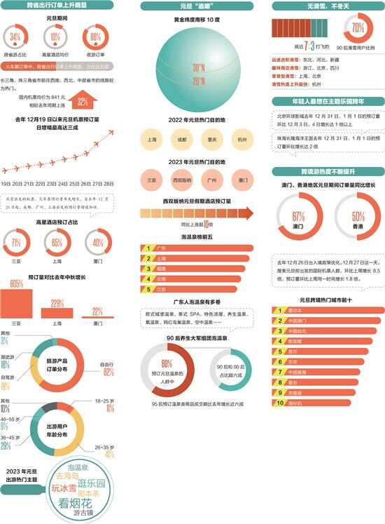 璀璨的烟火装点迷人的跨年夜空、或南下追暖或北上投入冰雪、各地多元的文旅体验奉上元旦大餐……作为疫情防控优化后的首个小长假,正有序恢复的旅游市场,给了游客迈出家门的勇气。全国游客怀着对新一年的憧憬,开启跨年游,出行半径从以往小长假周边游的“2小时度假圈”向外辐射。综合多个旅游在线平台的数据,元旦跨省游比去年元旦增长超过三成,迫不及待奔向远方仍成为大多数用户的青睐。今年元旦一个有趣的现象是,与2022年元旦相比,今年人们喜欢“追暖”:三亚、厦门、广州、西双版纳的旅游热度都十分高涨。广东也当仁不让成为全国最爱泡温泉的省份。