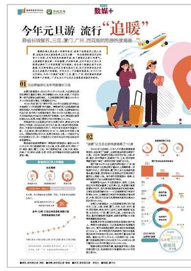 与2022年元旦相比,今年人们不愿在寒潮里瑟瑟发抖,纷纷南下“追暖”,出游的黄金纬度也南移了10度。元旦热门旅游目的地从去年的北京、上海、成都、重庆、杭州等城市,显著向广州、三亚、西双版纳等暖冬城市“南迁”,被网友戏称“追暖”过元旦。