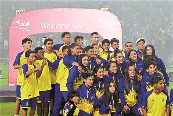 ■1月3日,C罗在欢迎仪式上与小队员合影。新华社发