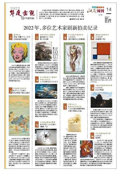 从拍卖总价看,年度最贵的十幅作品中有7幅来自佳士得拍卖,并且占头七个席位;苏富比拍卖则占2幅,分别名列第8、第10位;余下1幅来自富艺斯拍卖。但从各自领域的突破来看,2022年度则有不少惊喜。我们梳理“十之最”发现,多位艺术家刷新了各自的拍卖纪录,进一步推高了个人成交数据。