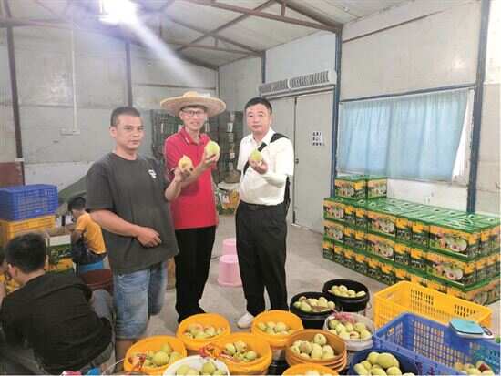 ■郑炜(右)带队到星丰农场把关消费帮扶产品鹰嘴桃的品质。