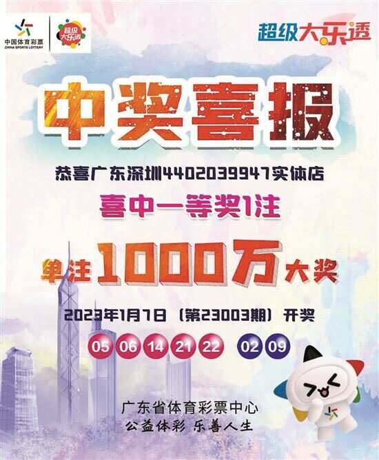 新快报讯 记者陆妍思报道 广东中出新年首注体彩千万大奖!1月7日,体彩超级大乐透第23003期开奖,全国中出2注1800万元追加头奖,4注1000万元基本头奖,其中广东中出1注1000万元,落户深圳。