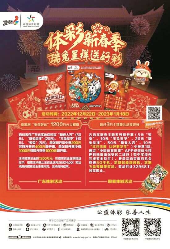 2022年12月22日至2023年1月18日期间国家体彩中心开展惊喜活动“体彩新春季,瑞兔呈祥送好礼”,凡购买卯兔(5元)、玉兔贺岁(10元)、瑞兔呈祥(20元)、新春大吉(50元)、红包来啦 让好事发生(10元)5款新春主题系列票中任意1款,通过体彩票APP或微信小程序扫描票面保安区二维码,登录活动页面就有机会获得5G手机、定制智能跳绳机、定制飞盘等精美礼品,共计32968份等你来领。