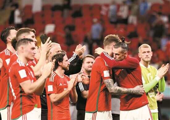 ■本届世界杯,威尔士队球员加雷斯·贝尔(右二)在比赛后与队友拥抱。 新华社发