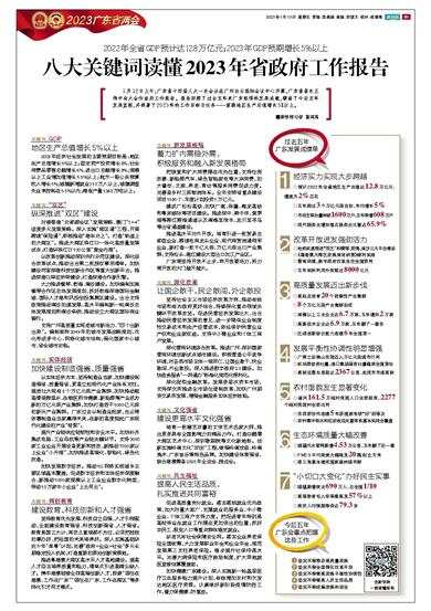 1月12日上午,广东省十四届人大一次会议在广州白云国际会议中心开幕,广东省省长王伟中向大会作政府工作报告。报告回顾了过去五年来广东取得的发展成就,擘画了今后五年发展蓝图,并部署了2023年的工作目标与任务——预期地区生产总值增长5%以上。