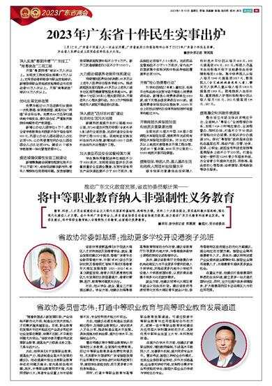 教育、科技、人才是全面建设社会主义现代化国家的基础性、战略性支撑。党的二十大报告提出,要实施科教兴国战略,强化现代化建设人才支撑。在今年的广东省两会上,多名省政协委员向省政协递交提案,助力推动广东文化教育科技事业发展。有委员建议,将中等职业教育纳入非强制性义务教育,全面推行免费教育。