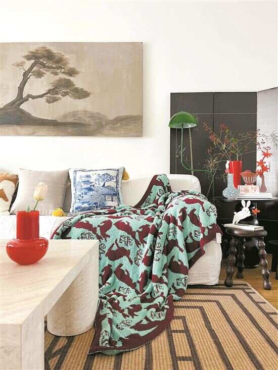 至于风格选择方面,不需拘泥于居室风格特点的限制,可以通过不同软装,融会贯通、随心所欲地把多种色彩、各种材质工艺、不同国家地域风情等元素融合在一起。毕竟,好看吸睛才是王道。以客厅为例,阿壹近段时间入手了一款红绿撞色的兔年盖毯,绵软的质感和彩色的兔子图案相得益彰,给家里增添童趣的同时,又不显得过于浮夸。地上则是铺上一块羊毛加黄麻的摩洛哥地毯,与一旁自制的国风屏风遥相呼应。