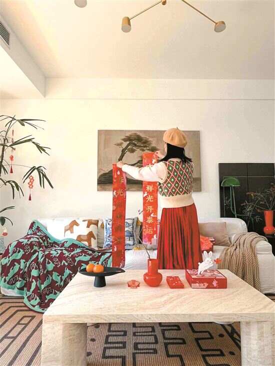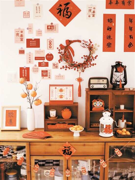 贴春联、写福字是毋容置疑的经典环节。自知手工能力羞涩的,在网上购买一套对联小纸,学着家中长辈的样子饱蘸浓墨、展纸挥笔,写下的却是“兔然暴富”“搞钱要紧”“及时行乐”等不乏俏皮幽默的词汇,再郑重地贴在玄关、客厅的大白墙上,与各种装饰画搭配一起,向新一年的自己及家人献上祝福。