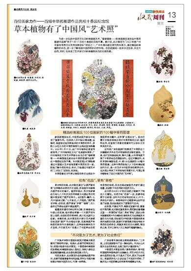 近年来广东的画家们觉察到了中草药这个关键题材并未在艺术领域得到足够的重视。于是,他们互相联动起来,集中力量,从本草角度开展了中草药命名的国画创作。经过不懈创作,共收录到岭南画坛老、中、青100位画家的100幅中草药图谱。这种中草药视角介入下的岭南绘画创作方式,是一次艺术与中医药学的跨界合作,也为观众带来了不同视角的观看方式,可谓让草本植物有了自己中国风的“艺术照”。