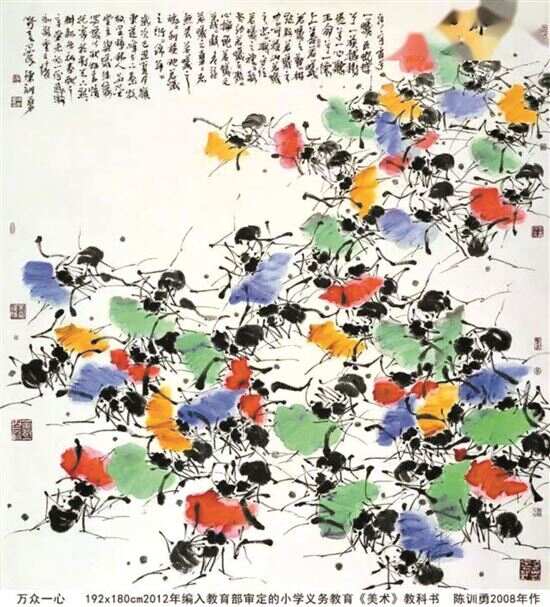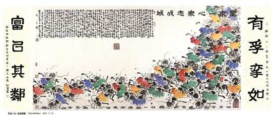 人们对于事物的认知都是在自己的角度上出发的。在日常生活中,我们经常可以看到以某一物做一个系列的文化艺术节。比如:荔枝可以举办一个“荔枝文化节”:做荔枝宴,填荔枝词,作荔枝诗,写荔枝赋,追荔枝源,寻荔枝史。我缘蚁二十年,以蚁载道,以蚁问道,演绎国学,承载艺术,启迪人生。蚂蚁题材丰富且广泛,正如:“江上之清风,与山间之明月,耳得之而为声,目遇之而成色,取之无禁,用之不竭。”蚂蚁既有老庄的涵义,又符合儒家孝义之道……在我看来,“上善若蚁”已是哲学命题。除了自我的思索,更有许多有心人遇上蚂蚁相关的素材都会为我输送。诗、词、歌、赋、典籍、时事等等,随时都会触碰灵感。所以蚂蚁题材内涵不会枯竭,当下我更在意的如何提升完善笔墨语言表达——这才是“路漫漫其修远兮”的无止境探索。