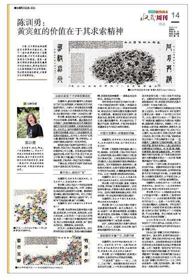 收藏周刊:新快报收藏周刊上两期采访了好几位名师画家,对黄宾虹的艺术成就进行探讨。大部分人肯定黄宾虹在笔墨上探索,但也有人认为黄宾虹的风格太高冷,没必要在年轻人中推广,对此您怎么看?