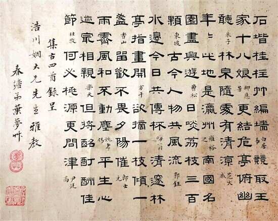 广州艺术博物院藏有其道光元年(1821年)的《碧嶂红棉图》及道光七年(1827年)、十八年(1838年)的山水、花鸟、梅花四件作品。现介绍若虚斋藏其隶书《集古四首》诗稿册页。纸本,纵25厘米、横30厘米,款题:“集古四首录呈浩川姻大兄先生雅教,春塘弟叶梦草”,下钤:“梦草”双玉环形印、“春塘初稿”朱文印。此册页是叶梦草书赠亲家的。自谓初稿,实为其精心之作。尺幅虽小,但有以小见大的艺术效果。诗稿册页有三个特征: