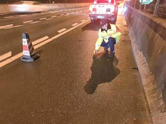 随后二广高速路政、养护会同高速交警在广州方向九嶷山至丰阳路段9公里摆放交通锥,通过压缩车道渠化交通。该路段广州方向封闭路肩及第一车道,第二车道可通行,湖南方向封闭路肩、两车道正常通行。