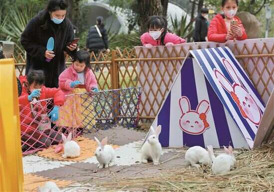 家兔、垂耳兔、荷兰兔,白色、灰色、灰白相间,软萌活泼的小兔子们一出现,瞬间俘获一众游客的心。“小兔兔,这里!”买票的小朋友拿着胡萝卜和草料体验喂食的乐趣,奈何兔子不给面子,“过家门而不入”。