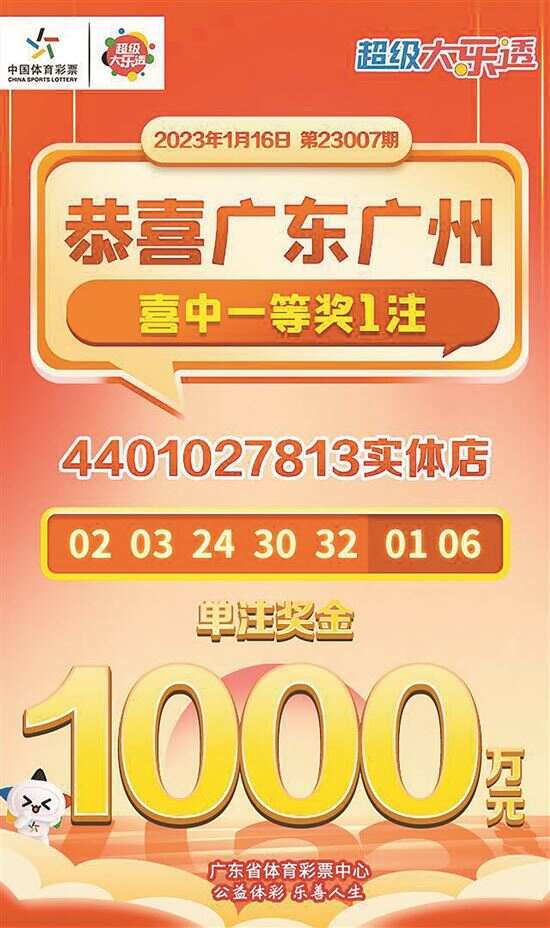 新快报讯 记者陆妍思报道 1月16日,体彩超级大乐透第23007期开奖,当期全国中出2注1000万元头奖,其中1注落户广州,由番禺一张72元复式票所中,总奖金达到1138万元。