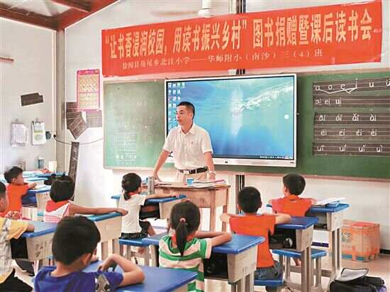 ■捐书仪式上,梁云尘给小学生讲工作队帮扶工作的方向和读书的好处。
