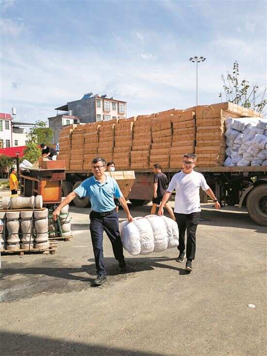■2022年英德市特大洪水期间,肖岸云(左一)与队员一同搬运救灾物资。