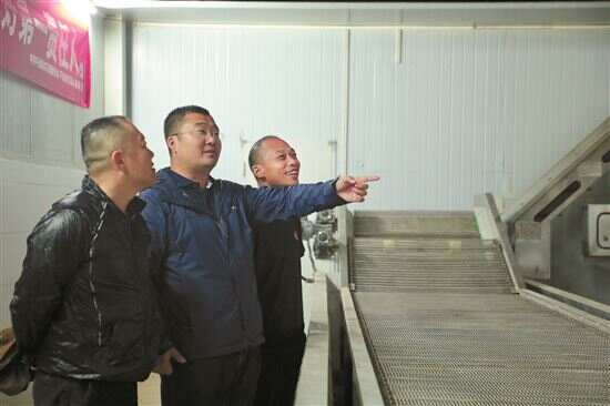 ■张立章(中)带领工作队队员查看花生加工厂的情况。