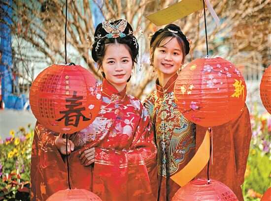 此外,现场还有诗词灯谜、投壶游园等弘扬传承中国传统文化的体验项目。花市主办方连续3天都安排了当下广受年轻群体喜爱的汉服走秀、汉舞表演和汉服巡游活动,除夕夜还组织了“千人同袍游花市”盛大汉服巡游,掀起欢乐喜庆迎新春的高潮。