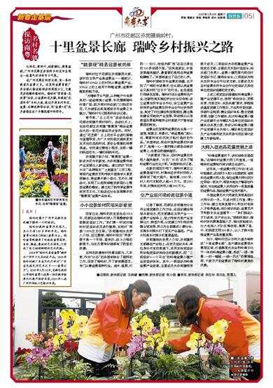 在广州花都区的西北部,有一条村被誉为盆景之乡。这里的盆景曾被广东当做礼物送给到访的英国女王,它就是赤坭镇的瑞岭村。瑞岭村“贺新春·花旅赏”活动,以盆景和花为媒,串联起“花漾年华”乡村大道,通过开展系列年花、盆景、龙狮巡游等活动,将“盆景+花”成为渗透在这个乡镇肌理中的符号。