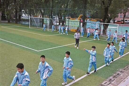 在课堂中,陈老师多次询问运动中的同学们是否有不适,并走近队伍观察大家的面色和表情。在结束两项运动后,陈老师要求同学们自测心率,把手搭上自己的手腕,看看是否有心率过快的情况。在操场的另一边是一年级的小朋友们,他们的第一节体育课内容主要为绕校园慢走、简单游戏,更具趣味性。