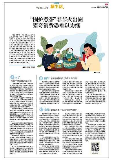 “围炉煮茶”是一种休闲方式,从去年秋天起,这种源自云南的“火塘烤茶”在全国多地掀起了一股风潮,成为今年春节的网红项目。抖音上,相关话题的视频播放量超过40亿次;微博相关的话题阅读量超1.2亿,小红书上话题浏览量也有1000多万,茶叶的选择、炭炉还是电炉等都成了热门话题。同时,因围炉煮茶而频频爆出的安全问题也引人关注。“围炉煮茶借生活之名,却并没有体现它特有的内涵。”一家知名茶企负责人认为,其内涵是三五好友谈天品茶,如今消费者多是猎奇心理,而一些商家用劣质茶叶只会损害其发展。新浪科技关于“围炉煮茶”的满意度调查也印证了这一观点,仅有11%的顾客愿意成为“围炉煮茶”的回头客。