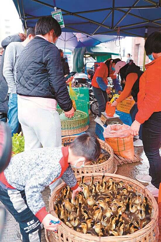 墟市的鸡鹅鸭真生猛,一栏栏、一笼笼,呱呱呱叫个不停,在这里鸡同鸭讲,太可乐了,比动物园热闹多了。它们按只卖,价格要比广州城区便宜。“墟市买鸡,好处是看到毛色形态,好与不好,一目了然。”买了一只大扇鸡的张伯说。