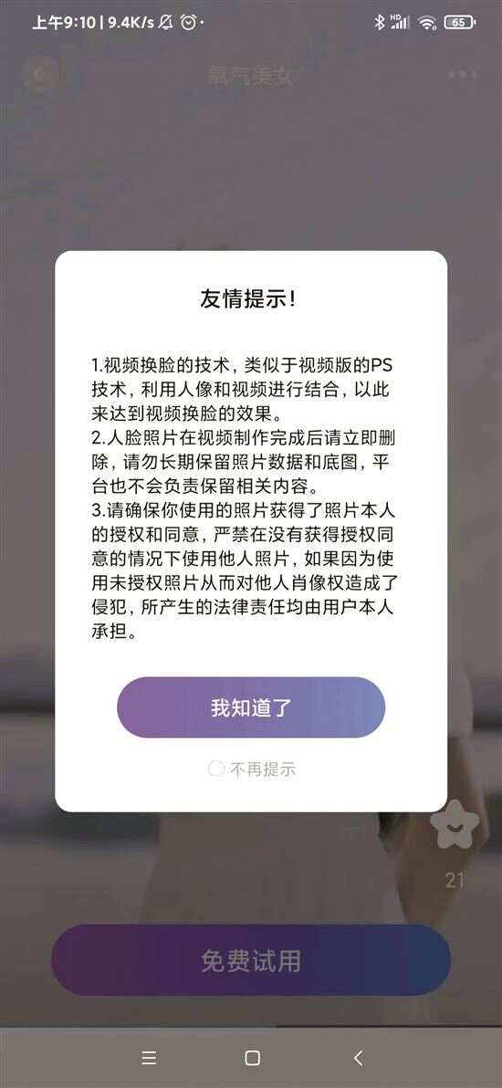 记者下载了“一键换脸”“AI换脸秀”“FacePlay(秀脸)”“AI换脸”等四款深度合成技术应用软件,使用软件前均出现了大同小异的提醒:“视频换脸技术类似视频版PS技术,利用人脸图像和视频结合。人脸照片在视频合成后会立即删除,不会保留你的人脸照片和数据。”“请确保你使用的照片获得本人授权同意,严禁使用未获得本人授权同意的照片,如因照片未授权对他人肖像权造成侵犯所产生的法律责任由本人承担。”
