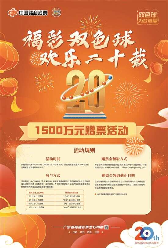 为庆祝双色球游戏上市20周年,广东省福彩中心将从双色球游戏第23017期(2023年2月16日晚开奖)起,在全省范围内(不含深圳市)开展“福彩双色球,欢乐二十载”1500万元赠票活动,活动至应赠票金额达到1500万元的当期双色球游戏期结后停止。