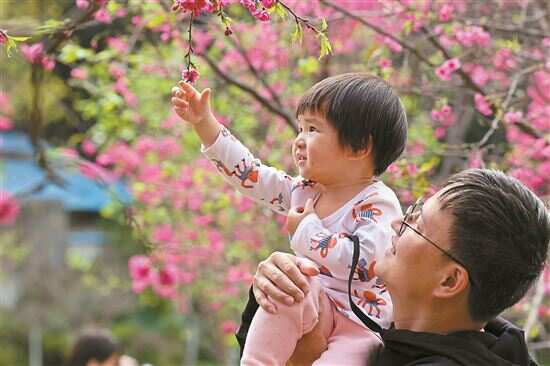 ■11日,华南农业大学校园内樱花盛放,家长带着孩子欣赏满园春色。VCG图