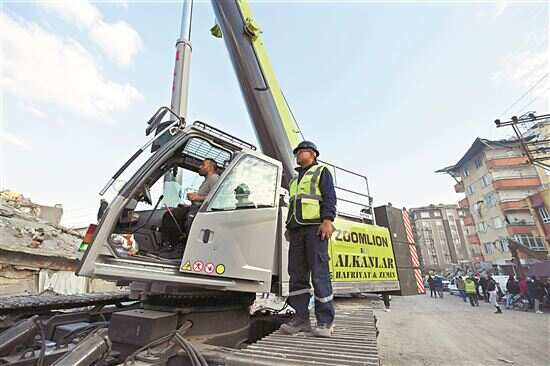 ■2月10日,中联重科救援队队员余可(右)在土耳其哈塔伊省安塔基亚市参与搜救。新华社发