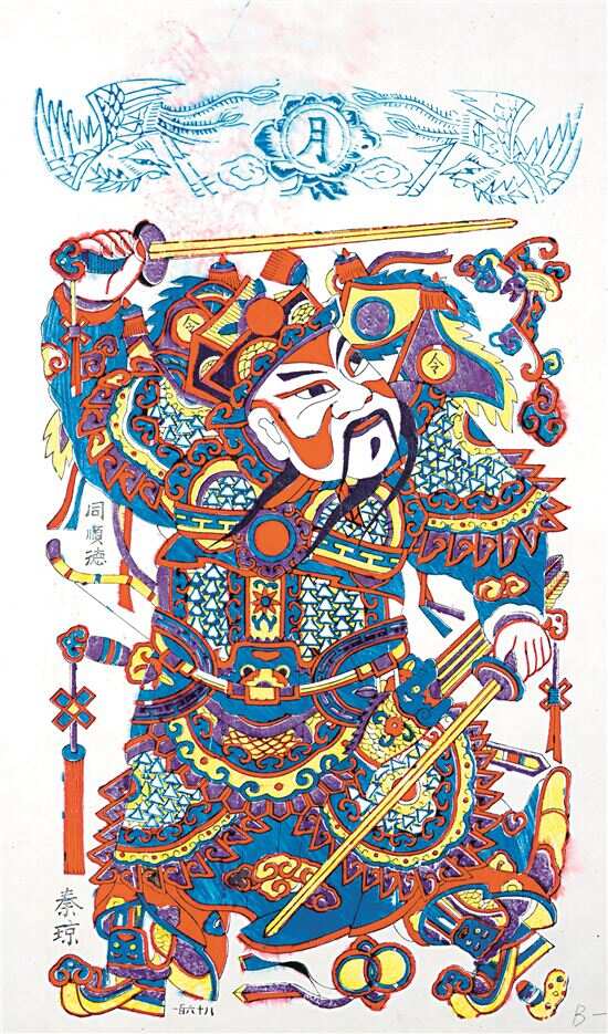 门神,是年画的头号主角。几千年来,从宫廷到民间,门神一直是华夏民族最喜爱的艺术形象、不可或缺的精神寄托。年画最早起源于门神画。最早的门神是神荼、郁垒,出自神话传说汉代《河图括地象》,记载了桃都山“上有金鸡,下有二神”,因此,神荼郁垒、金鸡、老虎、桃木都成早期门神形象。其后,才发展到秦琼尉迟恭、天师钟馗、万古将军关云长,乃至“天官”“财神”“福神”“福禄寿三星”,林林总总。当时的人们,求神,求的是四海八荒儒释道百神。