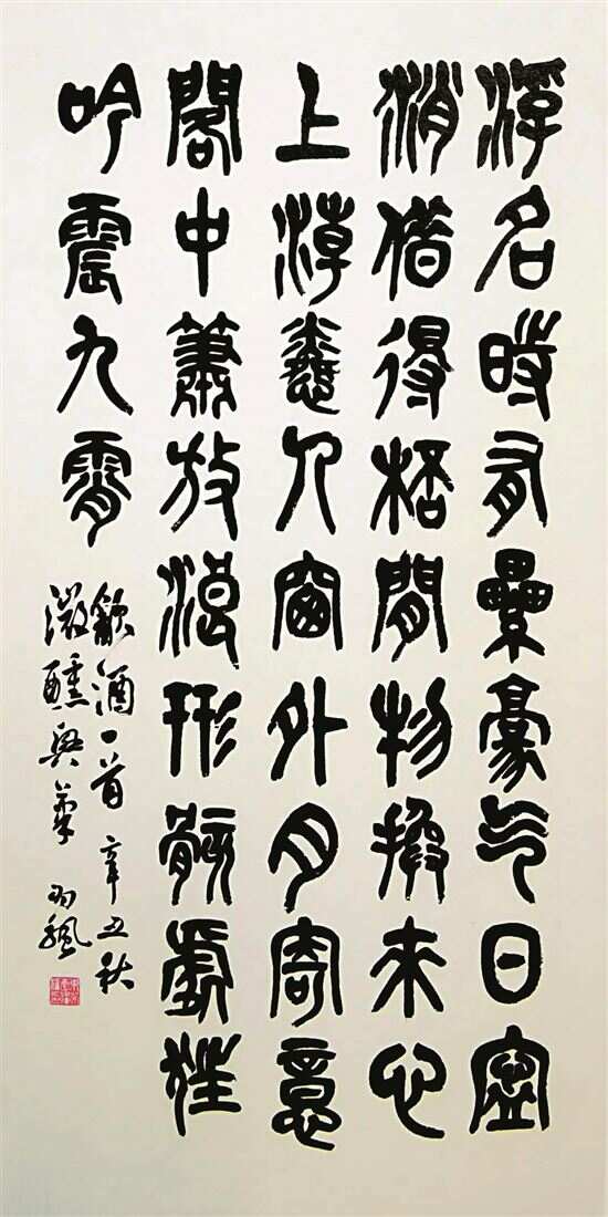 如果直面文本,从创作角度看,我们认为,李耀权的书法多以大小二篆和甲骨面目示人,而且形成了线条圆转舒展;用笔藏露兼备;结体匀称,字形方正;章法工整规矩、疏朗雅致;气息温雅、静穆的个人面貌和样式。论其书体,皆出自古代书法楷模之正体;论其品质,则具有雅文化的特征。