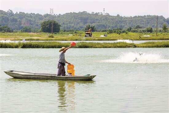 ■工作队引进的广东省太二农业科技有限公司“美丽渔场”项目落户肇庆市四会大沙镇陈冲村,图为工人在“美丽渔场”鱼塘中工作。