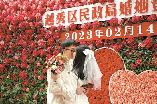 ■2月14日,一对新人在广州越秀区民政局登记结婚。昨日广州全市共办理婚姻登记1509对。新快报记者 林里/摄
