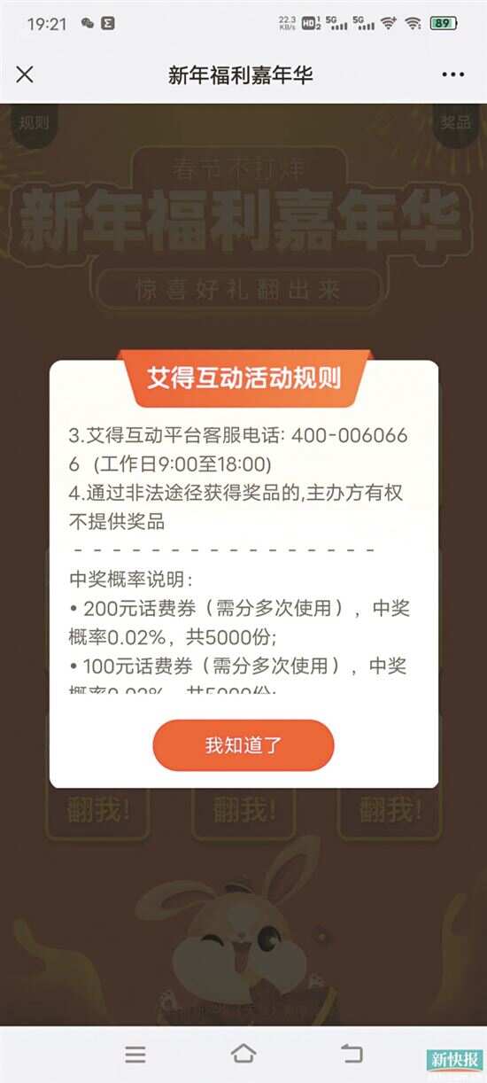 报料人、广州退休职工蒋女士回忆,2月5日晚上,她在睡前用华为手机浏览器看新闻时,无意中看到页面边栏有则广告“话费充值优惠”。出于对华为品牌的信任,近期刚好有充话费需求的蒋女士点了进去,手机自动弹出了一个搜狐新闻微信页面,再点进去就弹出一个“新年福利嘉年华”的抽奖页面,让用户“翻我”抽奖。