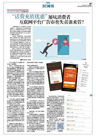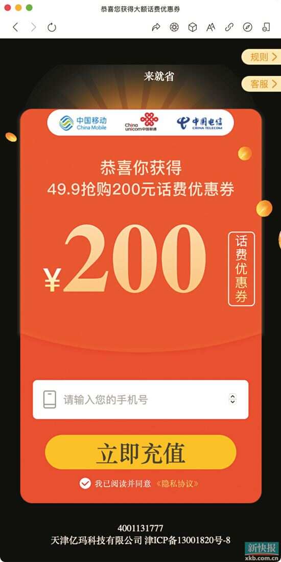 “恭喜你获得49.9元抢购200元话费优惠券”……看到类似的“天上掉馅饼还能砸自己头上”好事的市民们要小心了,新快报近日接到市民爆料,在用品牌手机看新闻时看到“话费充值优惠”广告,点击参与后“被骗”损失金钱。