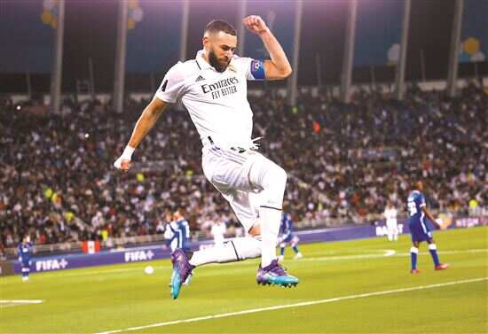 ■上周,2022年度世俱杯刚刚在摩洛哥战罢,欧冠冠军皇家马德里战胜亚洲球队利雅得新月,时隔4年再度赢得世俱杯。图为皇马球员本泽马庆祝进球。新华社发