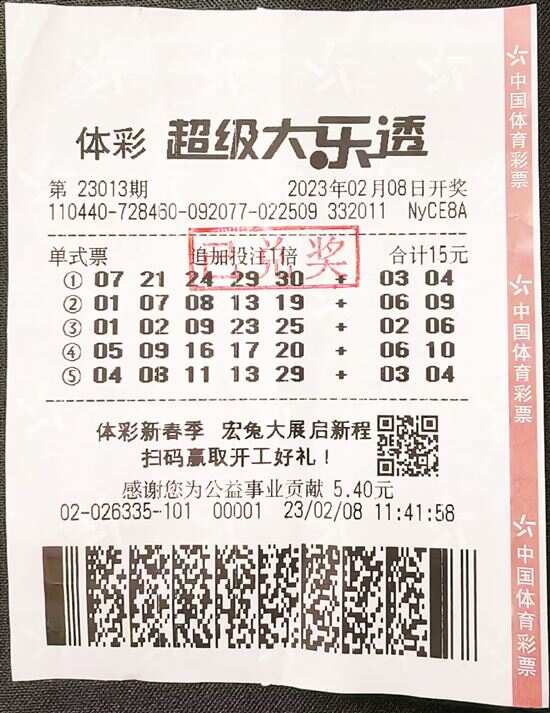 2月8日,欢先生在深圳龙华区龙华街道伍屋村5巷6-2号4402026335体彩实体店购买了一张投注金额15元的超级大乐透彩票喜中当期1注追加一等奖,共收获奖金1800万元,并贡献个人偶然所得税360万元。