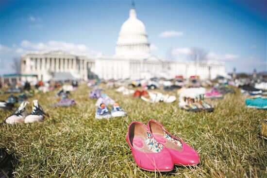 ■2018年3月13日,7000双代表自2012年美国康涅狄格州桑迪胡克小学枪击案以来,在枪击事件中遇难儿童的鞋子摆放在华盛顿国会山前的草坪上。呼吁枪支改革以保障儿童安全。新华社发